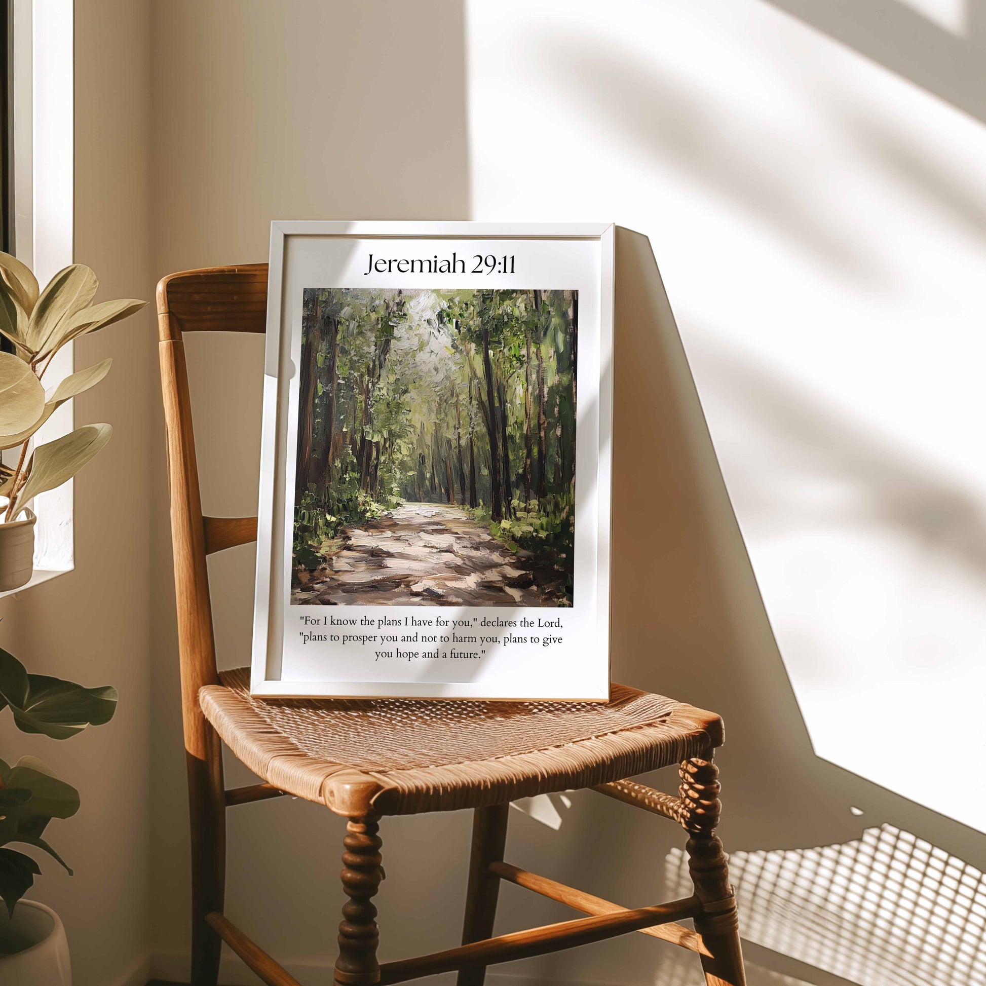 Featuring a peaceful woodland scene, this Jeremiah 29:11 print points to God’s guidance and the promise of a hopeful future. A comforting addition to any room.