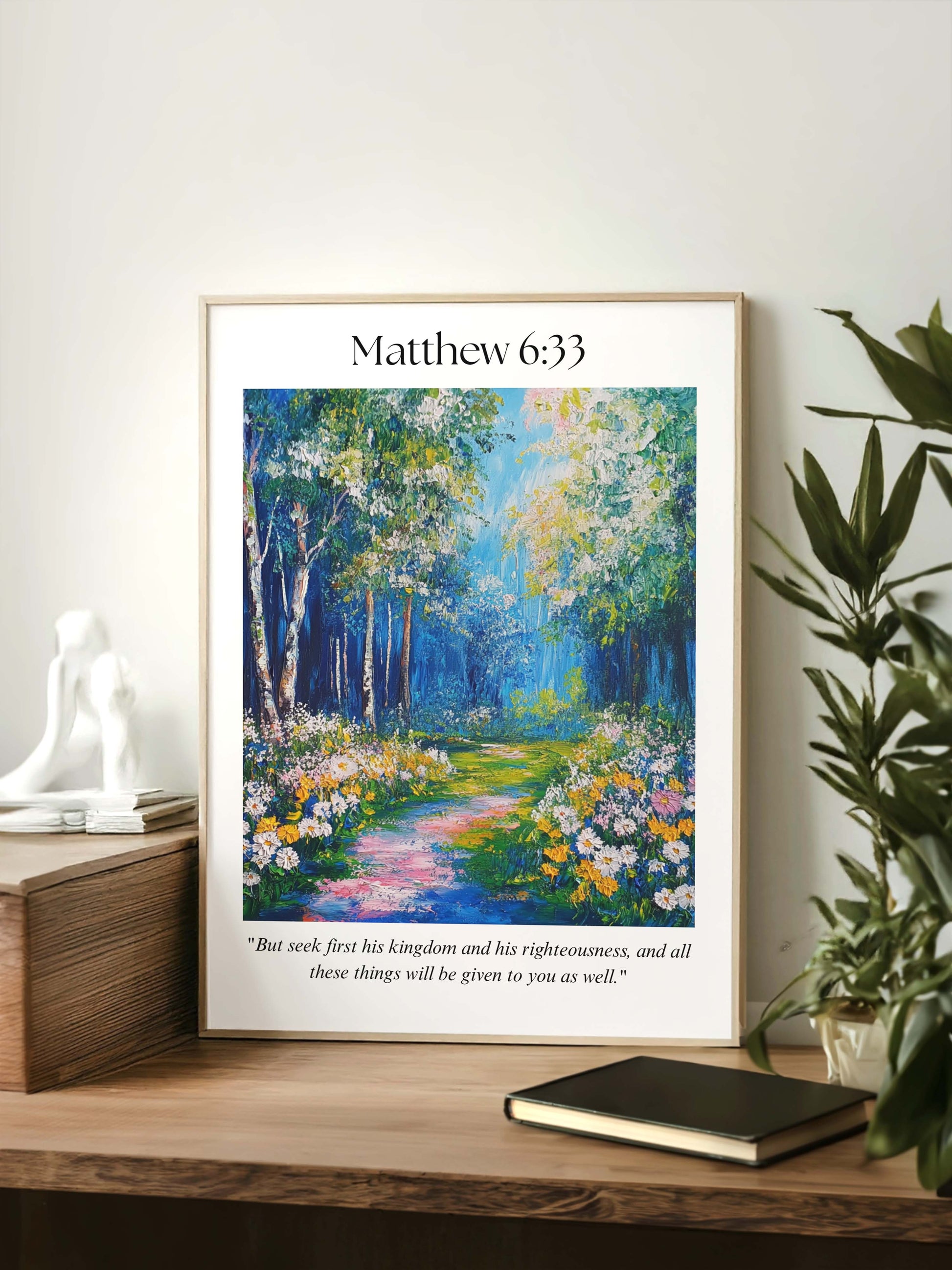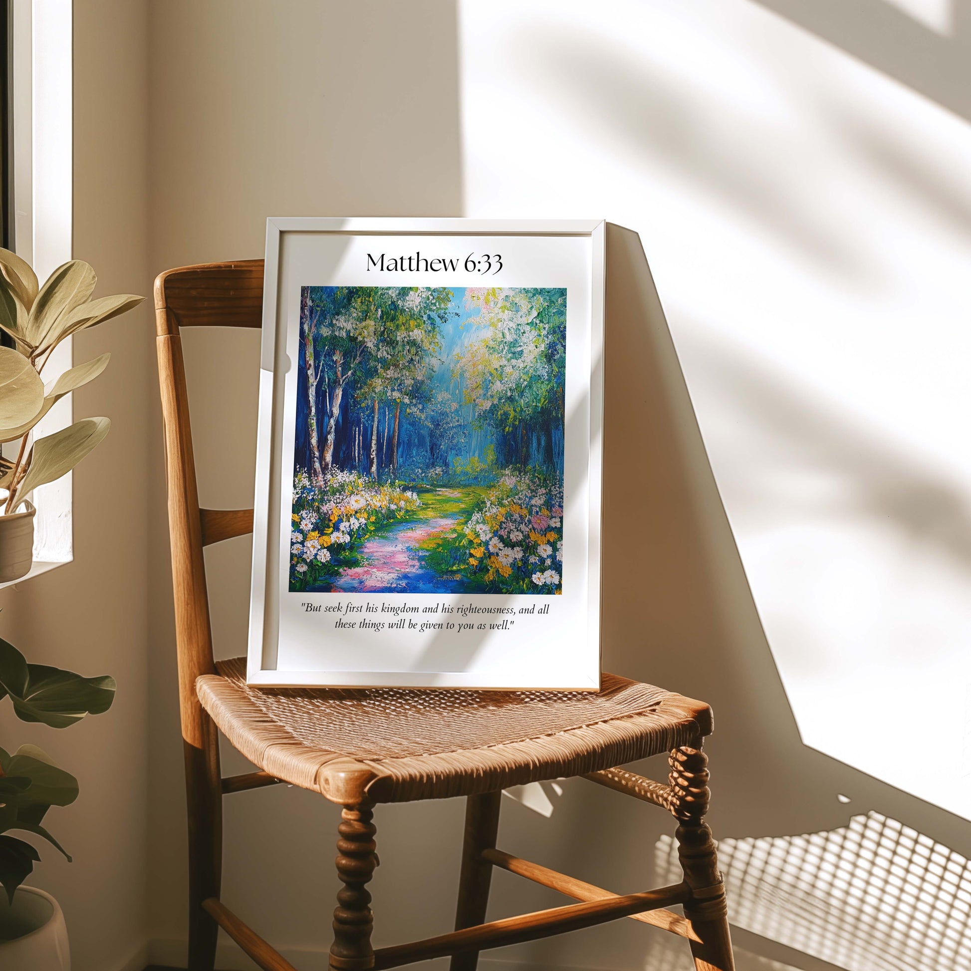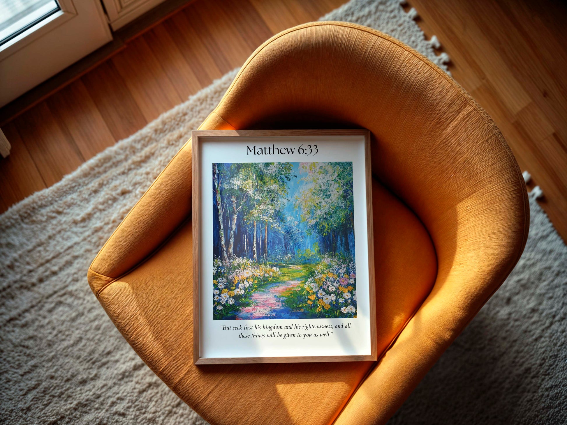 This Christian wall art inspired by Matthew 6:33 pairs peaceful scenery with a message of faith and trust in God’s care. A thoughtful and uplifting addition to any Christian home.