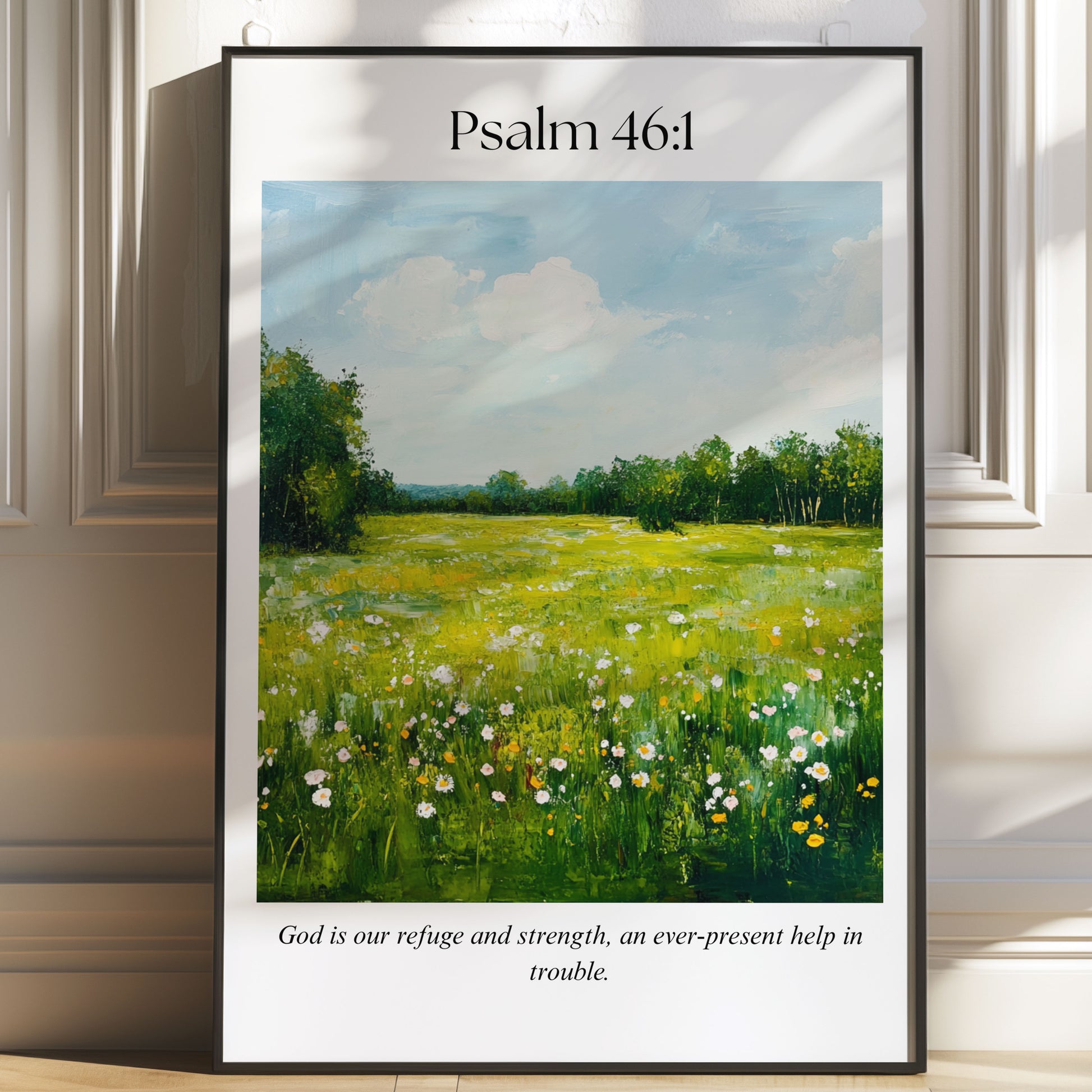 Featuring a calm meadow scene, this Christian wall art inspired by Psalm 46:1 offers quiet reassurance of God’s strength and care. A comforting addition to your home decor.